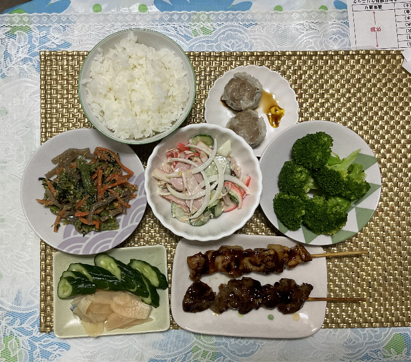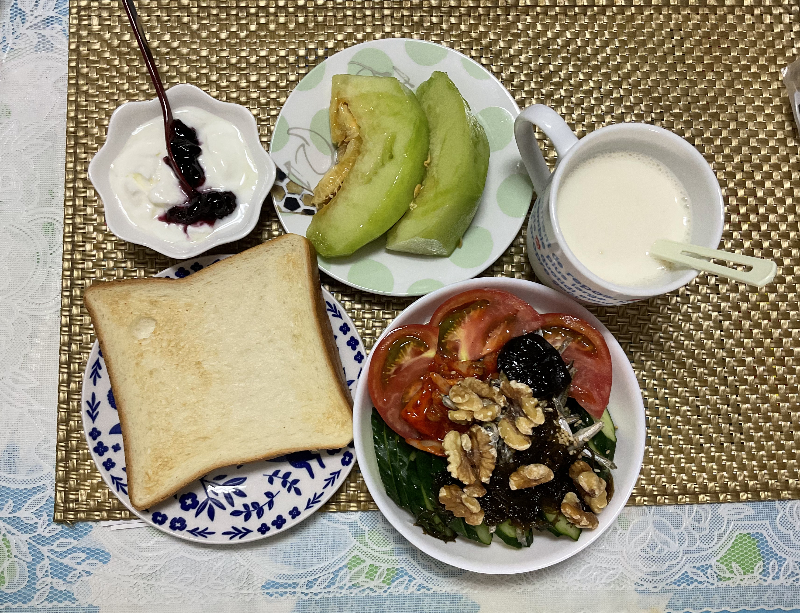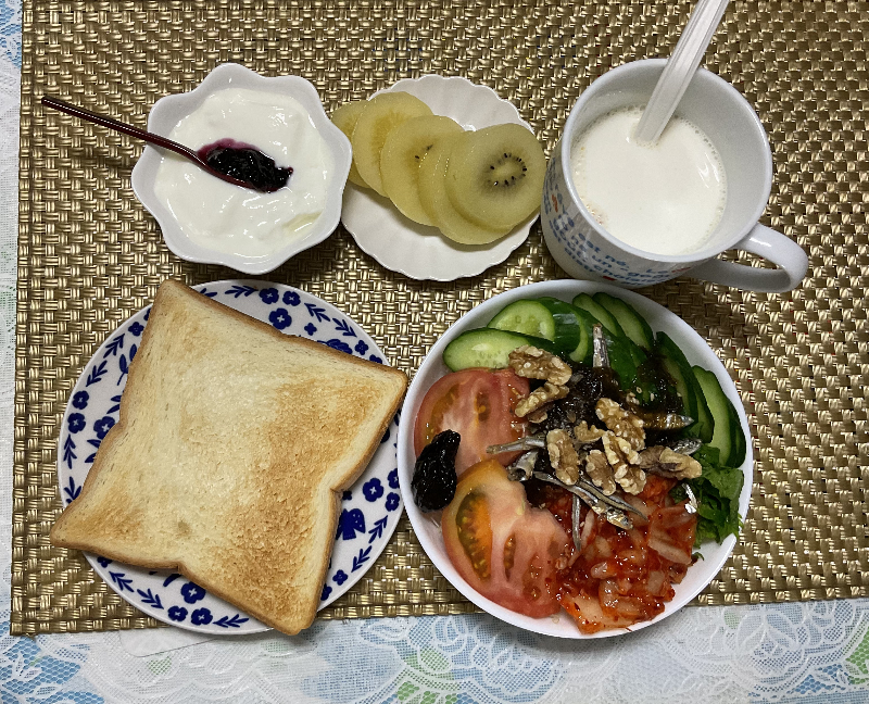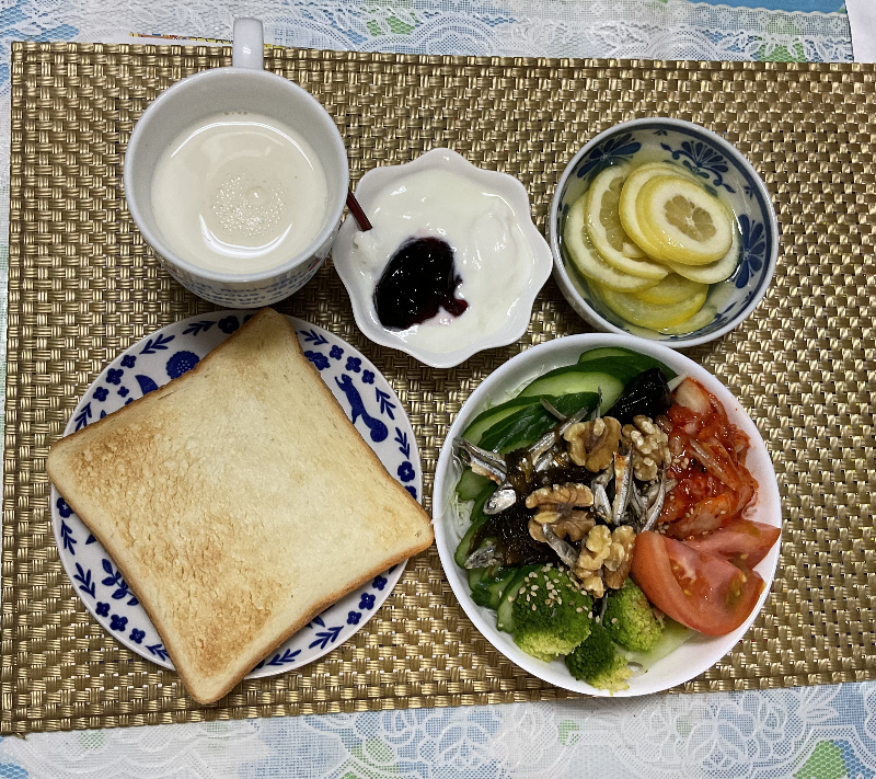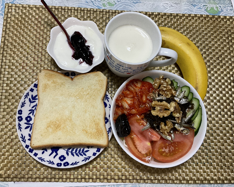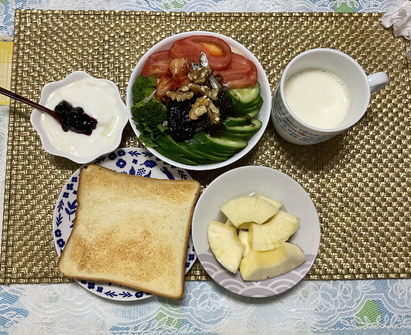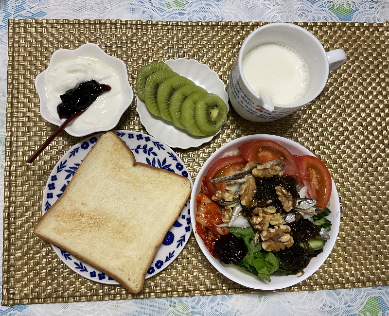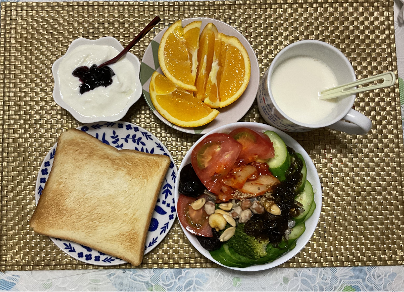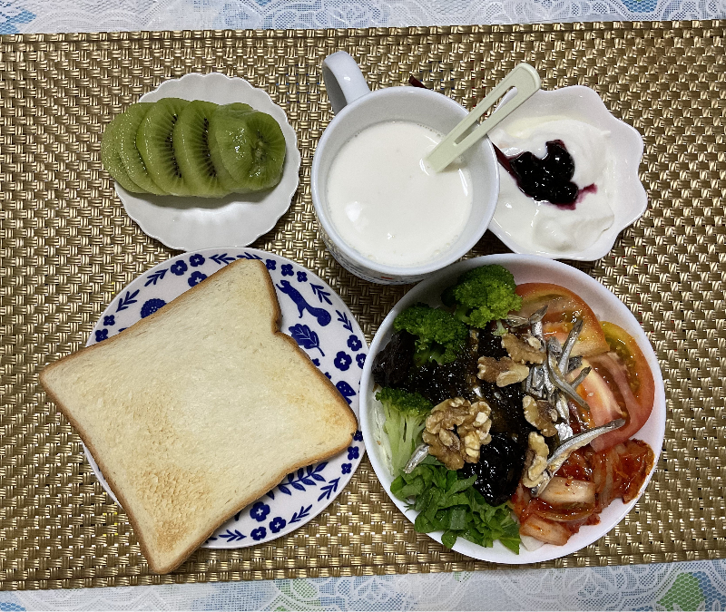 - トマト、キュウリ、キムチ、プルーン、ブロッコリー、くるみ、もずく、いりこ、ごま、玉ねぎ、キャベツ、のサラダ