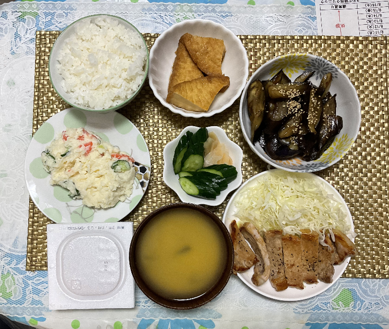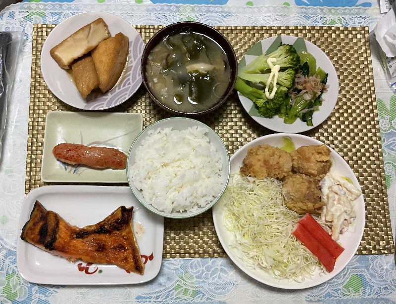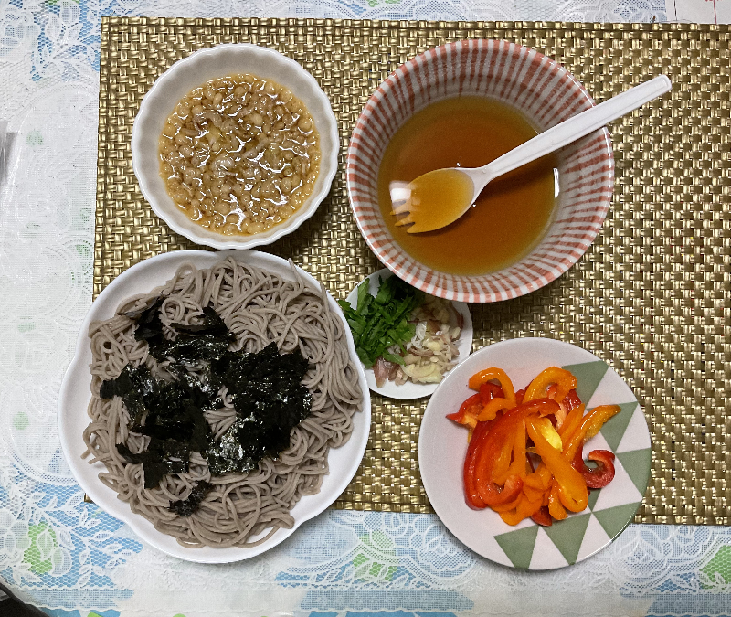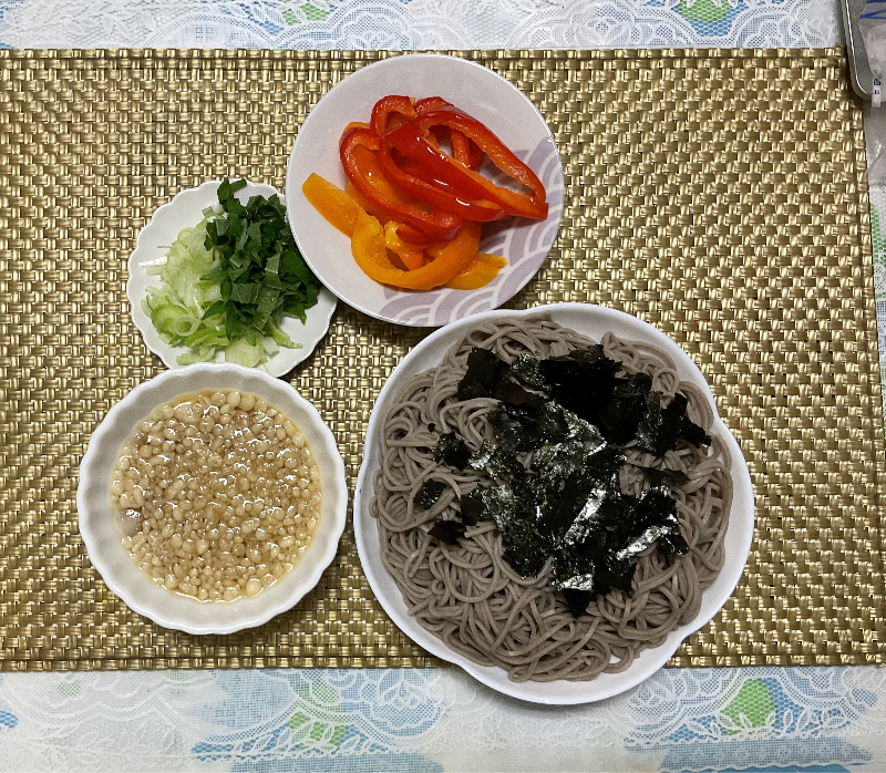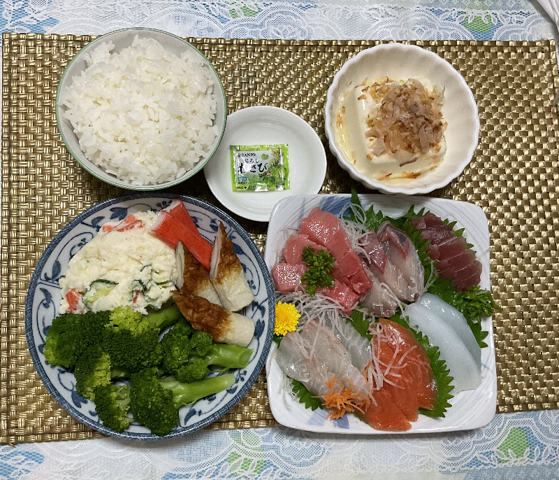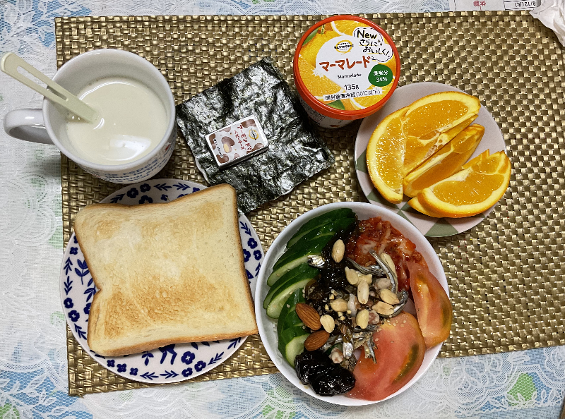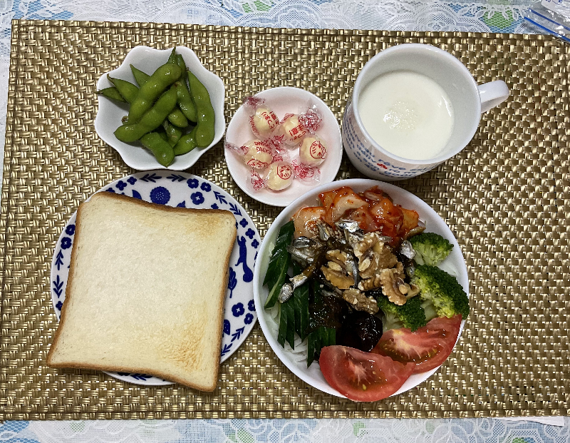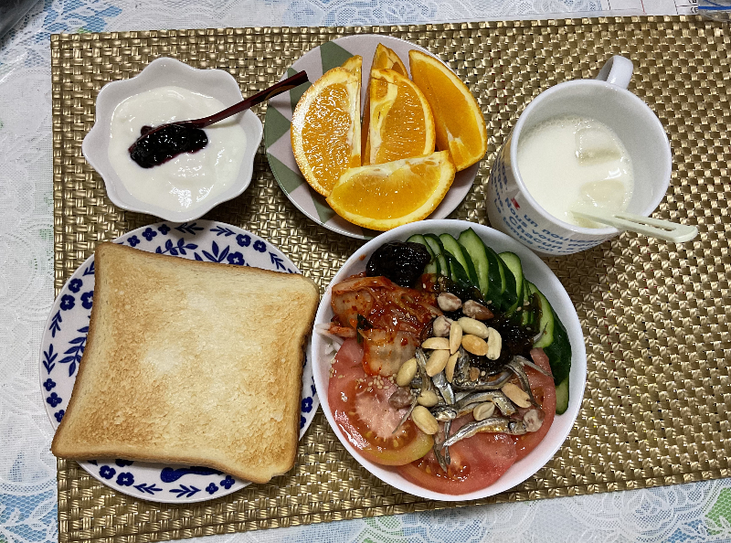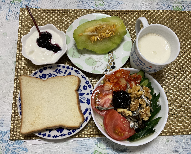- トマト、キュウリ、キムチ、プルーン、ブロッコリー、くるみ、もずく、いりこ、ごま、玉ねぎ、キャベツ、のサラダ