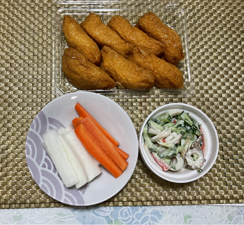 - 蓮根とひじきのおかかサラダ、ちくわ、カニカマ