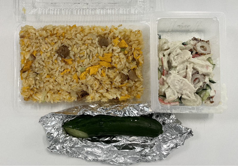 - 唐揚げ、マカロニサラダ、カニカマ、キャベツ