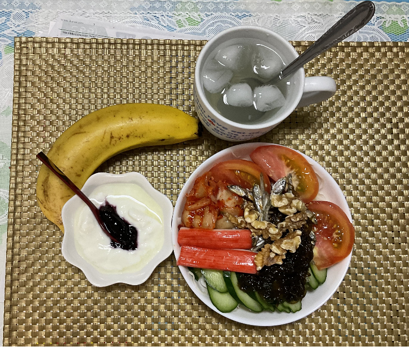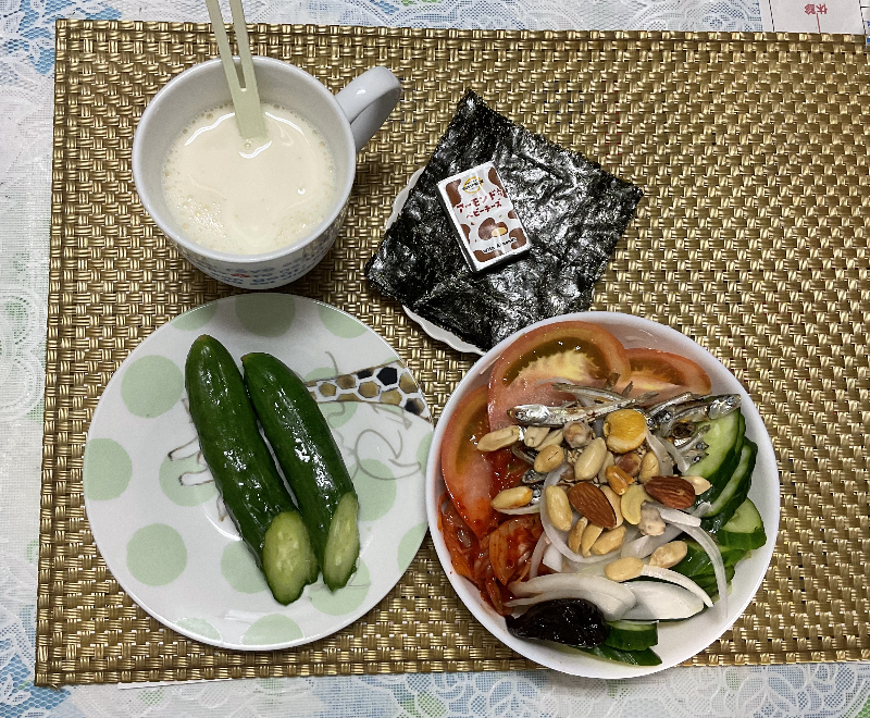 - キュウリ、トマト、プルーン、キムチ、ちくわ、ミックスナッツ、もずく、いりこ、ごま、玉ねぎ、キャベツ、のサラダ