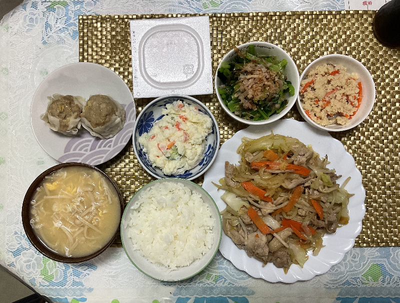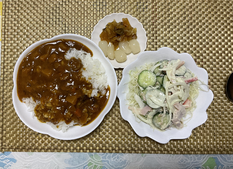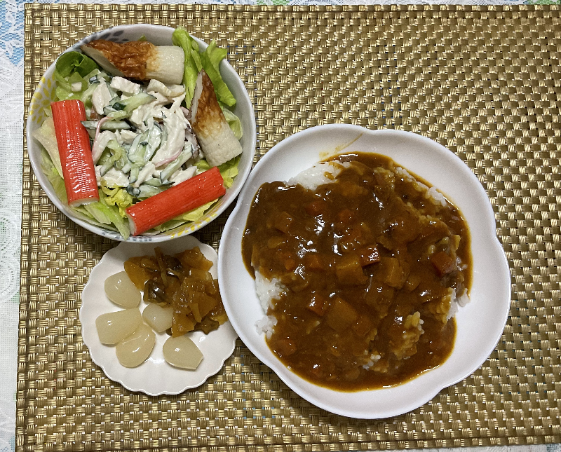 - トマト、キュウリ、プルーン、ちくわ、キムチ、ミックスナッツ、もずく、いりこ、ごま、玉ねぎ、キャベツ、のサラダ