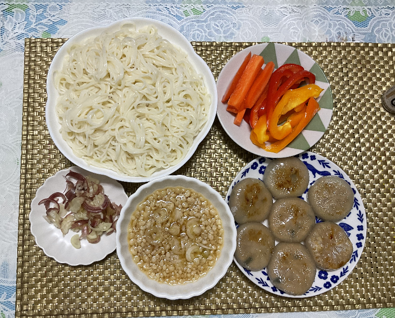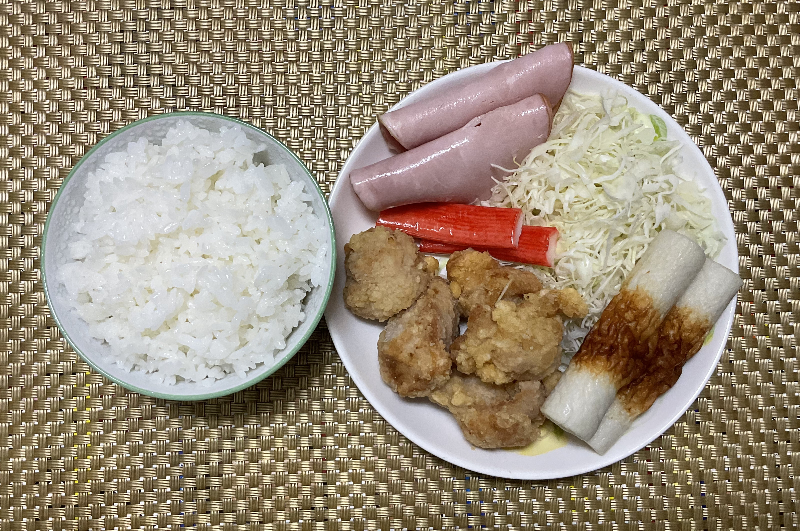- 唐揚げ、ちくわ、カニカマ、ハム、キャベツ