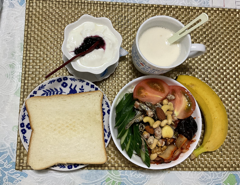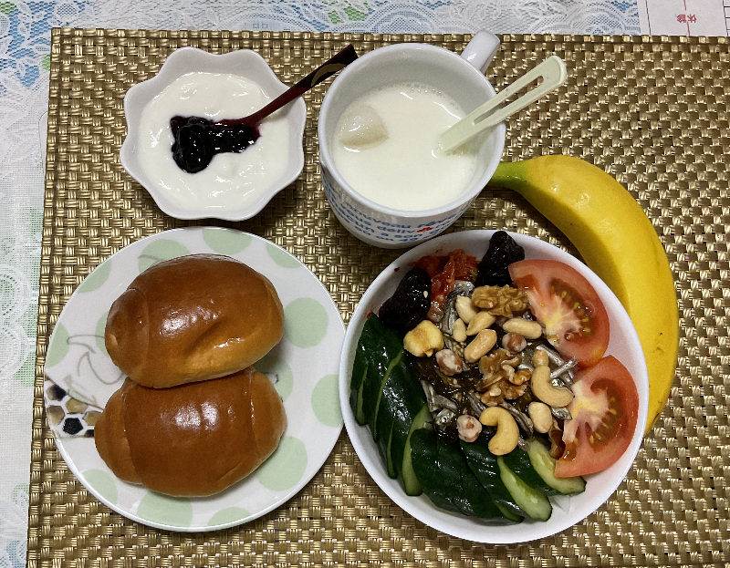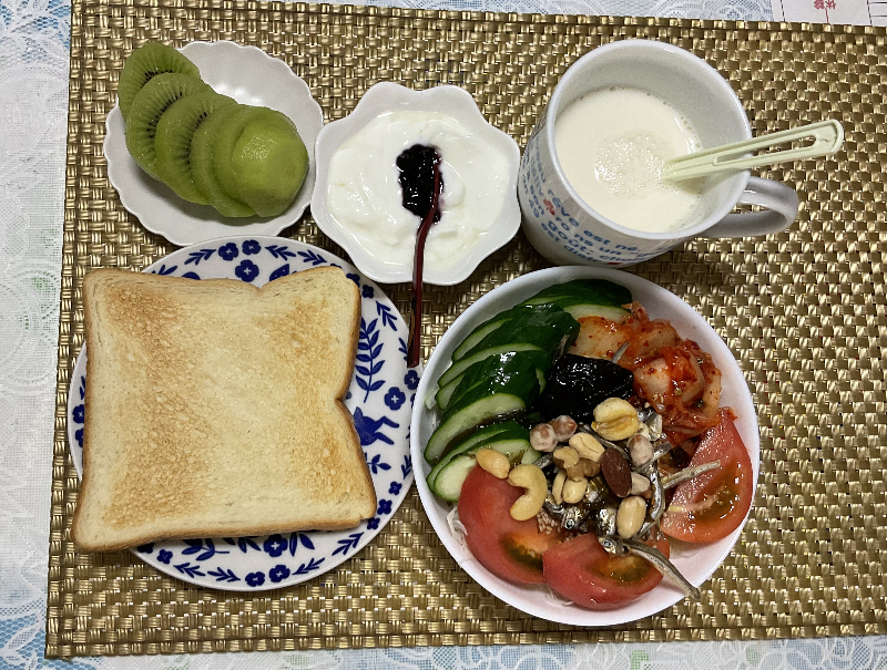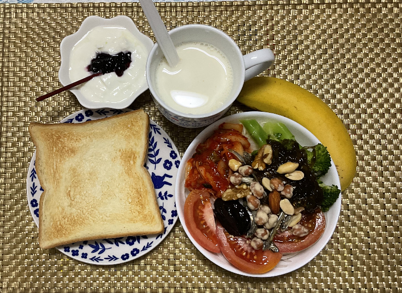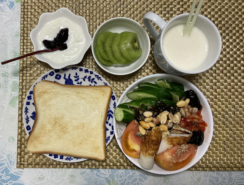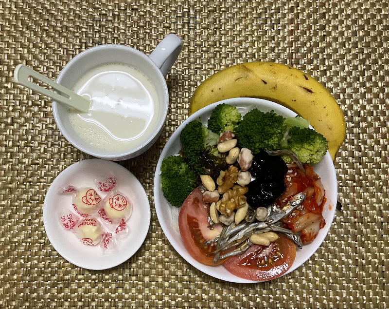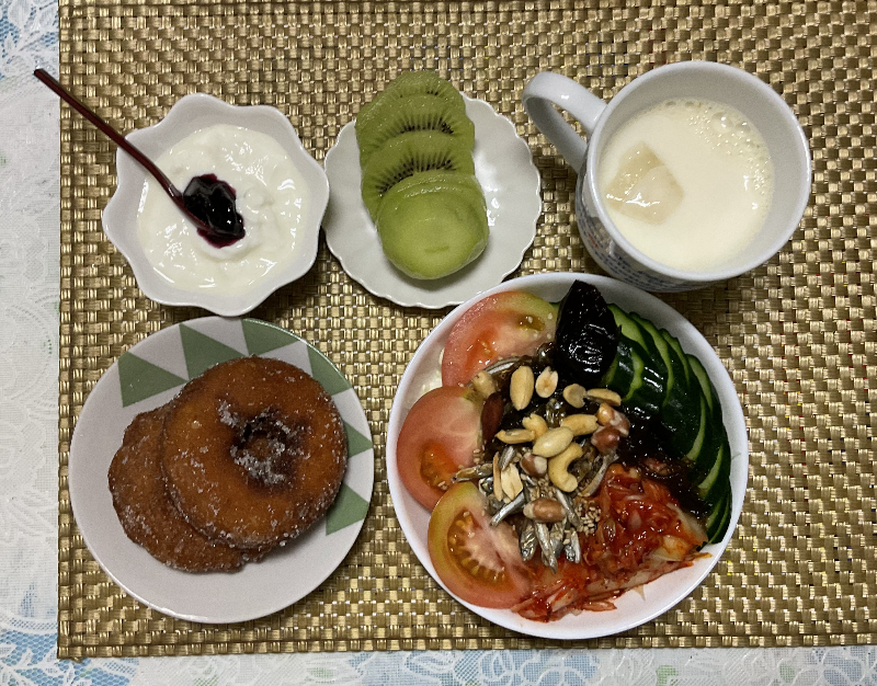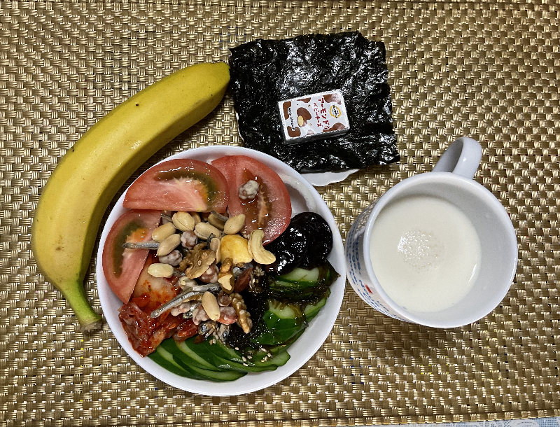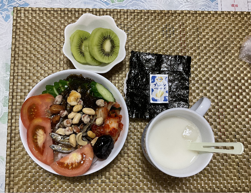 - トマト、プルーン、キュウリ、キムチ、もずく、いりこ、ごま、ミックスナッツ、玉ねぎ、キャベツ、のサラダ