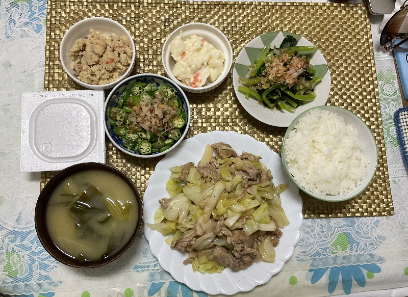 - トマト、キムチ、キュウリ、くるみ、もずく、いりこ、ごま、カニカマ、玉ねぎ、キャベツ、のサラダ