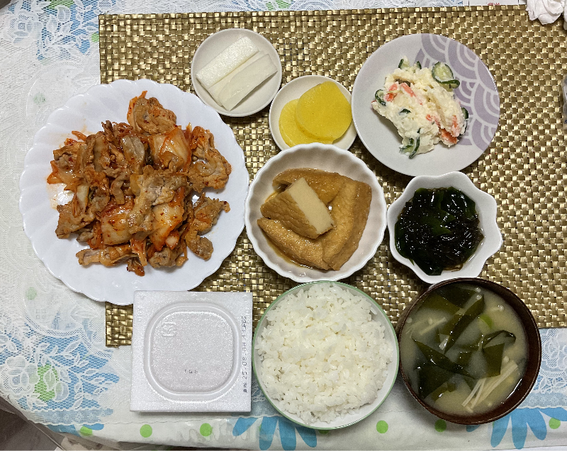 - キムチ、トマト、キュウリ、プルーン、ミックスナッツ、もずく、いりこ、ごま、玉ねぎ、キャベツ、のサラダ